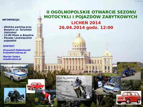 Po błogosławieństwie wszystkie pojazdy wezmą udział w uroczystej paradzie ulicami Lichenia. Organizatorem II Ogólnopolskiego Otwarcia Sezonu Motocykli i Pojazdów Zabytkowych w Licheniu jest klub motocyklowy Knight Riders z Łodzi.