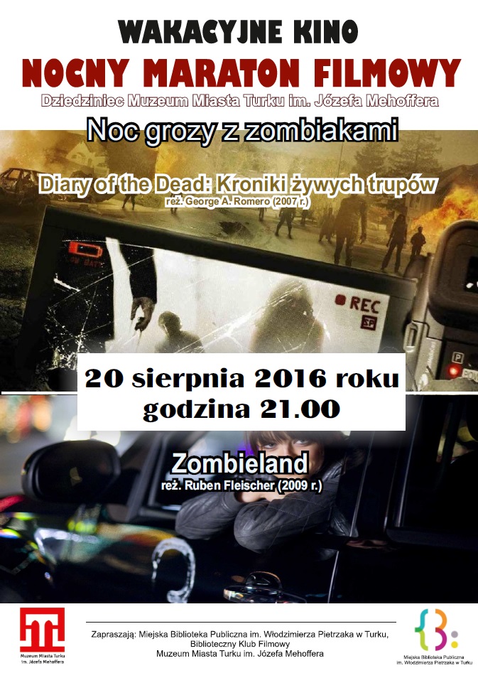 Wydarzenie odbędzie się pod hasłem „Noc z zombiakami”. Podczas seansu będzie można obejrzeć dwa filmy:„Diary of the Dead: „Kroniki Żywych Trupów”- reż. George A. Romero oraz „Zombieland” – reż. Ruben Fleischer Wstęp wolny. Serdecznie zapraszamy!