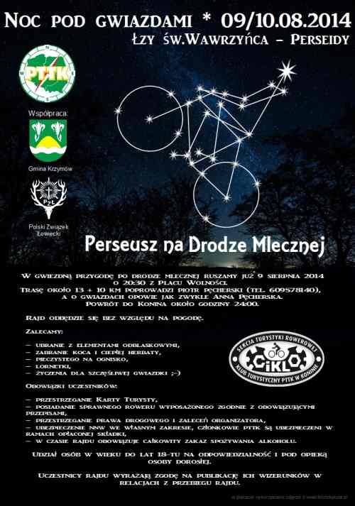 Do udziału w rowerowej nocy pod gwiazdami śladami łez św. Wawrzyńca czyli Perseid zachęca sekcja CIKLO konińskiego oddziału Polskiego Towarzystwa Turystyczno-Krajoznawczego. Rajd odbędzie się 9 sierpnia. Zbiórka o 20:30 na Placu Wolności. Liczącą ponad 20 km trasą sympatyków dwóch kółek poprowadzi Piotr Pęcherski, a o gwiazdach tradycyjnie opowiadać będzie Anna Pęcherska. Powrót do Konina planowany jest na godz. 24:00.