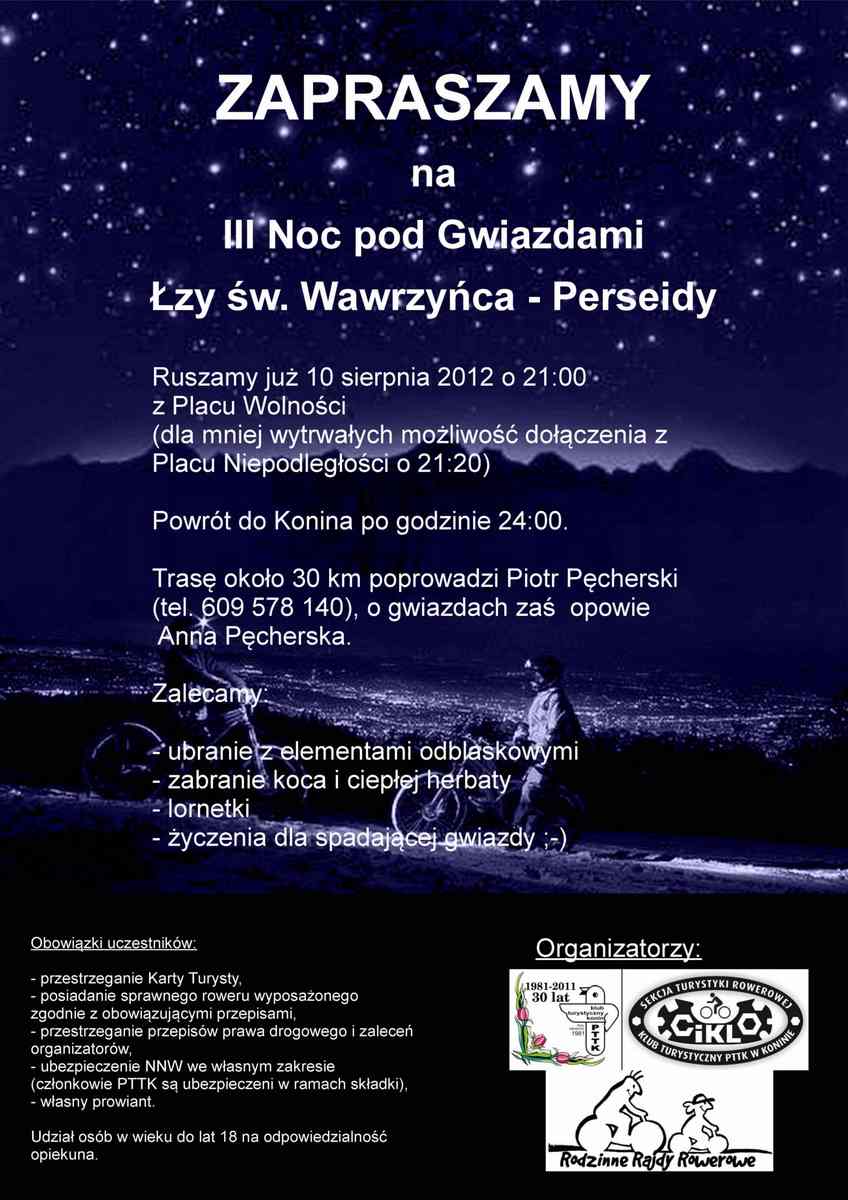 Łzy św. Wawrzyńca-Perseidy – to hasło kolejnej, III już Nocy pod Gwiazdami, organizowanej przez Polskie Towarzystwo Turystyczno Krajoznawcze oddział w Koninie.