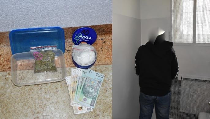 Podczas policyjnego rozpracowania u mężczyzny w mieszkaniu nieumundurowani funkcjonariusze ujawnili 21 gramów suszu roślinnego oraz 62 gramy białego proszku, dodatkowo zabezpieczone zostały pieniądze w kwocie 1000 złotych. Znalezione substancje zostały sprawdzone testerem narkotykowym po którym potwierdziło się, że jest to marihuana oraz amfetamina.