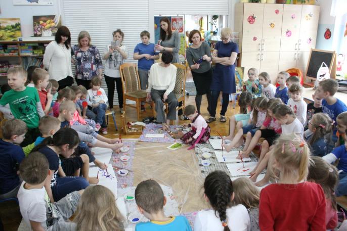 Choroba nie przeszkodziła jej jednak w rozwijaniu swojej pasji, jaką jest malowanie. Swoje dzieła wykonuje od 25 roku życia i doszła do takiej wprawy, że obraz powstaje zazwyczaj w ciągu jednego dnia. Pani Małgorzata przyjechała do nas z Włocławka. Jest stypendystką „AMUN” – Światowego Związku Artystów Malujących Ustami i Nogami. Do związku przyjmowani są jedynie artyści, którzy prezentują odpowiedni poziom artystyczny, wyróżniają się talentem i jakością pracy. Nasz gość przyjechał do nas ze swoja rodziną – mężem i córeczką Justynką, która wspólnie z mamą prezentowała dzieciom sposób malowania stopą. Przedszkolaki dzielnie przyłączyły się do tego zadania i w krótkim czasie powstało wiele pięknych prac.