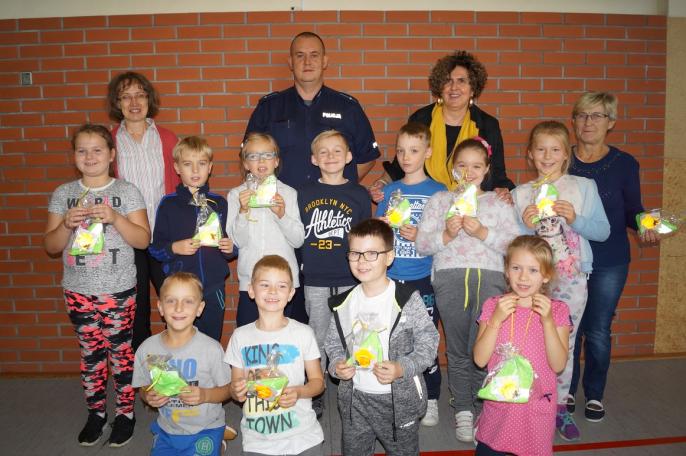Dzieci odwiedzili: dzielnicowy sierż.szt. Ireneusz Bobrowski, asp.szt. Marlena Kukawka oraz Przewodnicząca Gminnej Komisji ds. Rozwiązywania Problemów Alkoholowych p. Magdalena Kasprowicz. Podczas spotkania funkcjonariusze informowali dzieci o zagrożeniach, z jakimi mogą się spotkać w życiu codziennym oraz wskazywali, jak sobie radzić w trudnych sytuacach. Szczególny nacisk mundurowi położyli na bezpieczne zachowania pieszych na drodze. Zachęcali do noszenia elementów odblaskowych, szczególnie teraz jesienią, gdy szybko zapada zmrok. Pieszy poruszający się po zmroku bez żadnych elementów odblaskowych dla kierowcy nadjeżdżającego samochodu jest widoczny dopiero z odległości ok. 20 metrów. Jeżeli pieszy używa odblasków, wówczas jest zauważalny z odległości ok. 150 metrów. Dzięki temu kierowca może wcześniej zauważyć osobę i znacznie szybciej zareagować, zwolnić i ominąć.Funkcjonariusze podkreślali, że niewielki odblaskowy element przyczepiony do odzieży wierzchniej może zapobiec tragedii.