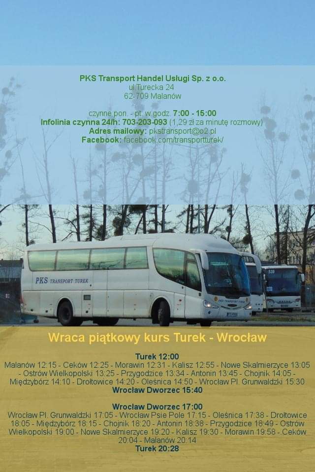 PKS Turek przywraca trasy Aktualności 09/01/2019 Mniej niż 1 min. PROMOCJA Wydarzenia„Dzieciństwo bez przemocy” Konin włącza się w ogólnopolską kampanię.Redakcja LP - 16 godzin ago0KulturaStypendia Prezydenta Miasta Konina w dziedzinie kulturyRedakcja LP - 2 dni ago0WydarzeniaZACHWYTNIKI 2025 – Wielkopolska pełna inspiracji!Redakcja - 20/10/20250ZdrowieNowoczesna Klinika Neurologii ICZMP – „Pomagamy Jak Umiemy” RossmannRedakcja LP - 14/10/20250AktualnościROSSMANN „MOJA DROGERIA” – NOWY WYMIAR ZAKUPÓW I BLISKOŚCIRedakcja - 10/10/20250 FacebookTwitterWhatsApp MASZ WAŻNĄ WIADOMOŚĆ? Prześlij do naszej redakcji zdjęcie, film, lub informację! +48 63 242 01 01 - Reklama - PROMOCJA Wydarzenia„Dzieciństwo bez przemocy” Konin włącza się w ogólnopolską kampanię.Redakcja LP - 16 godzin ago0KulturaStypendia Prezydenta Miasta Konina w dziedzinie kulturyRedakcja LP - 2 dni ago0WydarzeniaZACHWYTNIKI 2025 – Wielkopolska pełna inspiracji!Redakcja - 20/10/20250ZdrowieNowoczesna Klinika Neurologii ICZMP – „Pomagamy Jak Umiemy” RossmannRedakcja LP - 14/10/20250AktualnościROSSMANN „MOJA DROGERIA” – NOWY WYMIAR ZAKUPÓW I BLISKOŚCIRedakcja - 10/10/20250 Tagikomunikacja,transportTurek Szukaj Konin zachmurzenie duże enter location 8.5 ° C 8.5 ° 8.5 ° 90 % 4.9kmh 100 % czw. 13 ° pt. 11 ° sob. 14 ° niedz. 15 ° pon. 13 ° Sygnał24INFO Zmiana organizacji ruchu przy cmentarzu w Sompolnie – 1 listopada 29/10/2025 Policjanci z Konina zabezpieczyli nielegalny tytoń i papierosy bez polskich znaków akcyzy 29/10/2025 Wyłączenie sygnalizacji świetlnej na skrzyżowaniu Przemysłowa – Paderewskiego w Koninie 29/10/2025 Uwaga! Fałszywi ankieterzy w gminie Kramsk – ważny komunikat dla mieszkańców 28/10/2025 Tymczasowa zmiana organizacji ruchu w Wilczogórze 28/10/2025 Poprzedni artykułZima w Koninie – Starostwo,most i cerkiew w śniegu –Następny artykułPrezydenci w Ciklo Mogłeś przegapić Uroczyste wręczenie stypendiów Wójta Gminy Władysławów Aktualności 30/10/2025 Poznajemy zawody – uczniowie ze Złotkowa odwiedzili Komendę Miejską Policji w Koninie Aktualności 29/10/2025 Radni Konina przegłosowali podwyżkę podatków od nieruchomości na 2026 rok Aktualności 29/10/2025