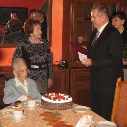 Do Konina sprowadziła się w latach siedemdziesiątych. Dziś w kawiarni Domu Pomocy Społecznej najstarsza podopieczna placówki przyjęła życzenia od prezydenta miasta Konina – Józefa Nowickiego oraz kierownika Urzędu Stanu Cywilnego – Reginy Raźnej.