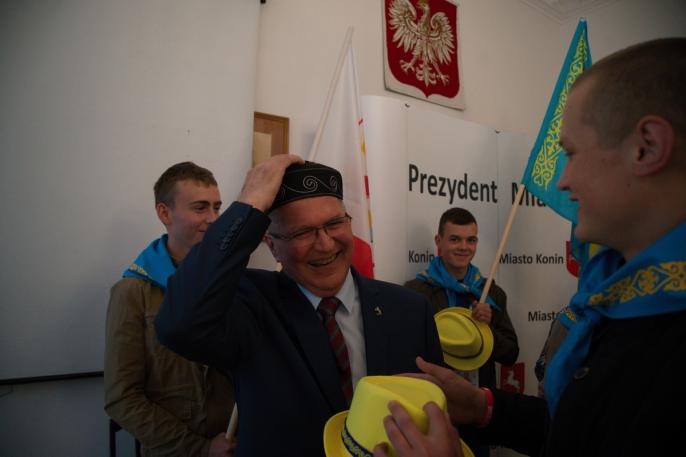 Prezydent Konina Józef Nowicki, w towarzystwie swoich zastępców – Sławomira Lorka i Sebastiana Łukaszewskiego, bardzo serdecznie przywitał młodych Kazachów, który zrewanżowali mu się równie szczerymi słowami, popartymi symbolicznymi prezentami – kapeluszem pielgrzymim oraz tradycyjnym kazachskim nakryciem głowy.