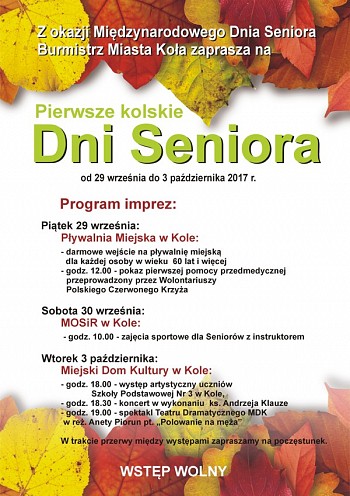 Z okazji Międzynarodowego Dnia Seniora Burmistrz Miasta Koła zaprasza na Pierwsze Kolskie Dni Seniora, które odbędą się w dniach od 29 września do 3 października 2017 roku.