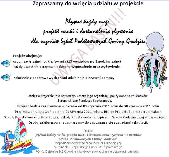 Pływać każdy może – to projekt nauki i doskonalenia pływania dla uczniów szkół podstawowych z terenu gminy Grodziec, który bezpłatnie realizowany jest dzięki środkom z Europejskiego Funduszu Społecznego do końca bieżącego roku szkolnego. Do piątku szkoły przyjmują zapisy dzieci, które chcą uczyć się pływać.Projekt obejmuje 15 wyjazdów na basen -za każdym razem zajęcia pływania trwać będą dwie godziny. Oprócz tego niezbędne wyposażenie młodego pływaka i wyżywienie. Dodatkowo każdy uczestnik kursu przejdzie szkolenie z zakresu udzielania pierwszej pomocy przedmedycznej, a to wszystko za darmo. Zgłoszenia przyjmowane są do 21 stycznia w sekretariatach szkół podstawowych w Królikowie, Lipicach i Biskupicach. Projekt skierowany do dzieci z terenu gminy Grodziec współfinansowany jest ze środków Europejskiego Funduszu Społecznego.