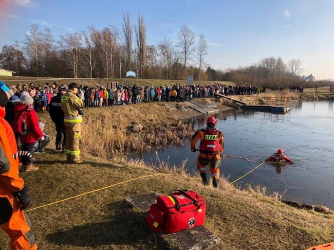 11 stycznia br. w Kole nad rzeką Warta zgromadzili się kolscy policjanci i strażacy. Na spotkanie zostali zaproszeni uczniowie kolskich szkół. Mundurowi w ramach działań „Bezpieczne ferie 2019” mówili zgromadzonym o niebezpieczeństwach wynikających z wchodzenia na zamarznięte zbiorniki wodne. Funkcjonariusze Państwowej Straży Pożarnej w Kole przeprowadzili pokaz udzielania pomocy osobom, które na skutek załamania się lodu wpadły do wody. Pokazali techniki ratowania człowieka, pod którym zarwał się lód. Ratownicy używają do tego specjalistycznych rzutek, desek i drabin. Co istotne – strażacy zaprezentowali też metody udzielenia pomocy osobie tonącej przez „przypadkowego” świadka, przy pomocy dostępnych przedmiotów jak gałęzie, szaliki itp. Udzielili też wskazówek jak samemu wydostać się z przerębla i co należy zrobić, aby bezpiecznie dotrzeć do brzegu akwenu wodnego