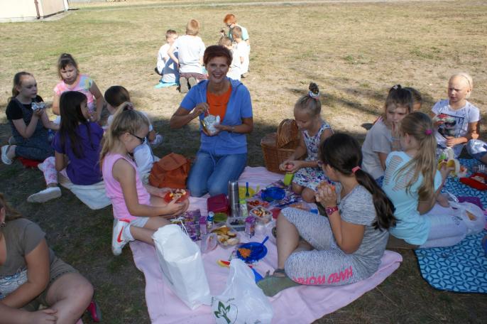 Wszyscy uczniowie Szkoły Podstawowej w Malanowie korzystając ze słonecznej aury spożyli drugie śniadanie wspólnie na świeżym powietrzu.