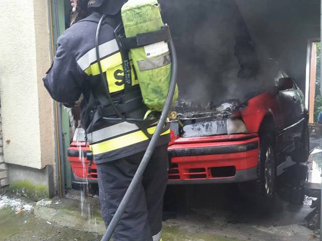 Po przybyciu na miejsce stwierdzono, że w garażu przylegającym do budynków mieszkalnych pali się samochód osobowy marki BMW.