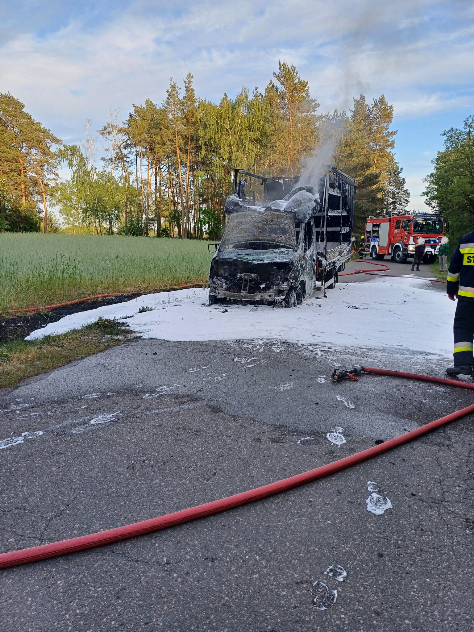 Po przybyciu na miejsce zastano całkowicie objęty pożarem samochód marki Renault Master. W momencie przybycia pierwszych zastępów straży pożarnej, dwie osoby podróżujące samochodem znajdowały się poza pojazdem i nie wymagały udzielania pomocy.