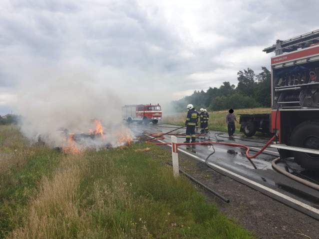 Po przybyciu na miejsce zdarzenia stwierdzono na drodze wojewódzkiej nr 263 pożar przyczepy rolniczej z balotami słomy w ilości 10 sztuk. Kierujący podczas jazdy zauważył, że na drugiej przyczepie zapaliła się słoma, po czym odczepił przyczepy od ciągnika rolniczego. Droga wojewódzka została całkowicie zablokowana.