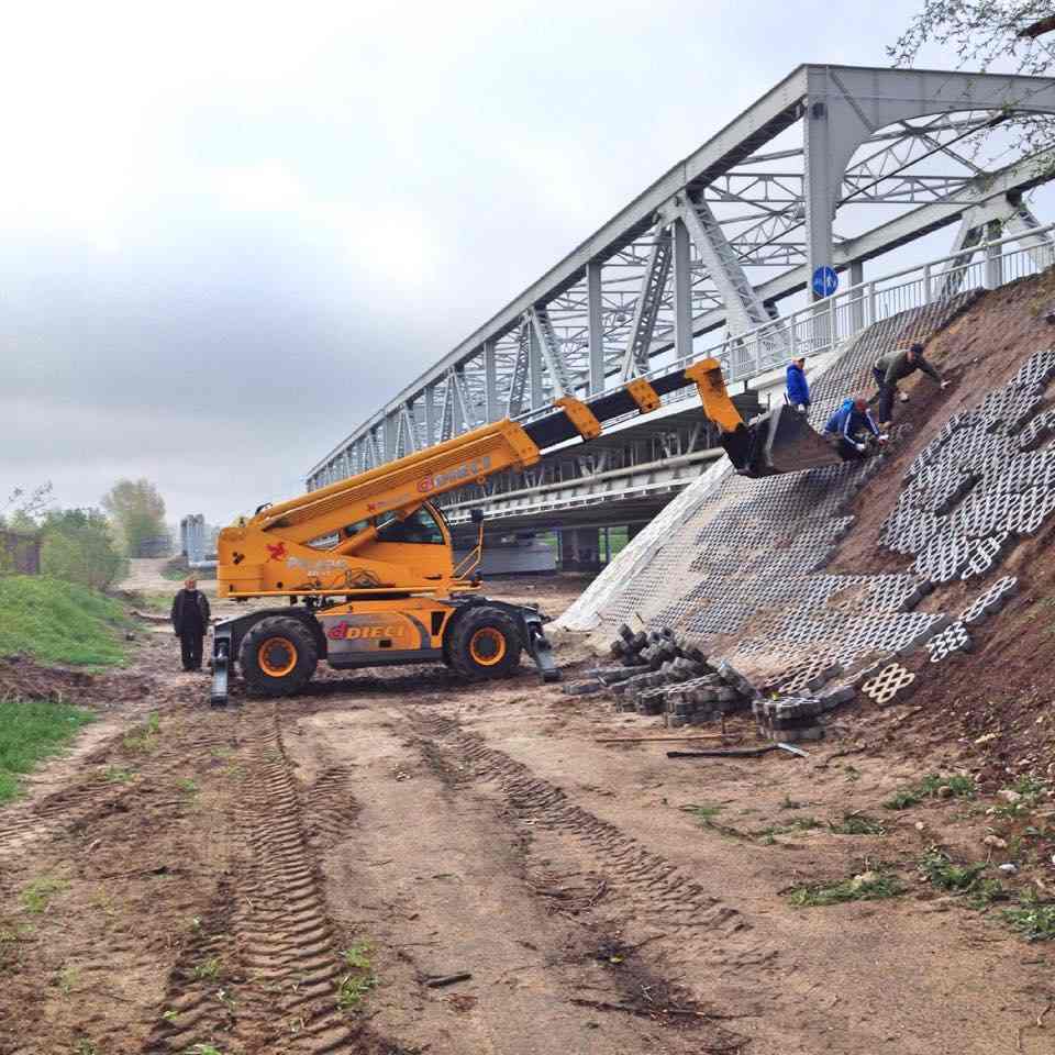 Wczoraj przy moście grupa robotników poprawiała i umacniała usypaną na potrzeby ścieżki rowerowej skarpę. Fotografię przedstawiającą tylko w części ułożone ażurowe płyty na jej zboczu opublikował wczoraj na facebooku Waldemar Duczmal z Akcji Konin.