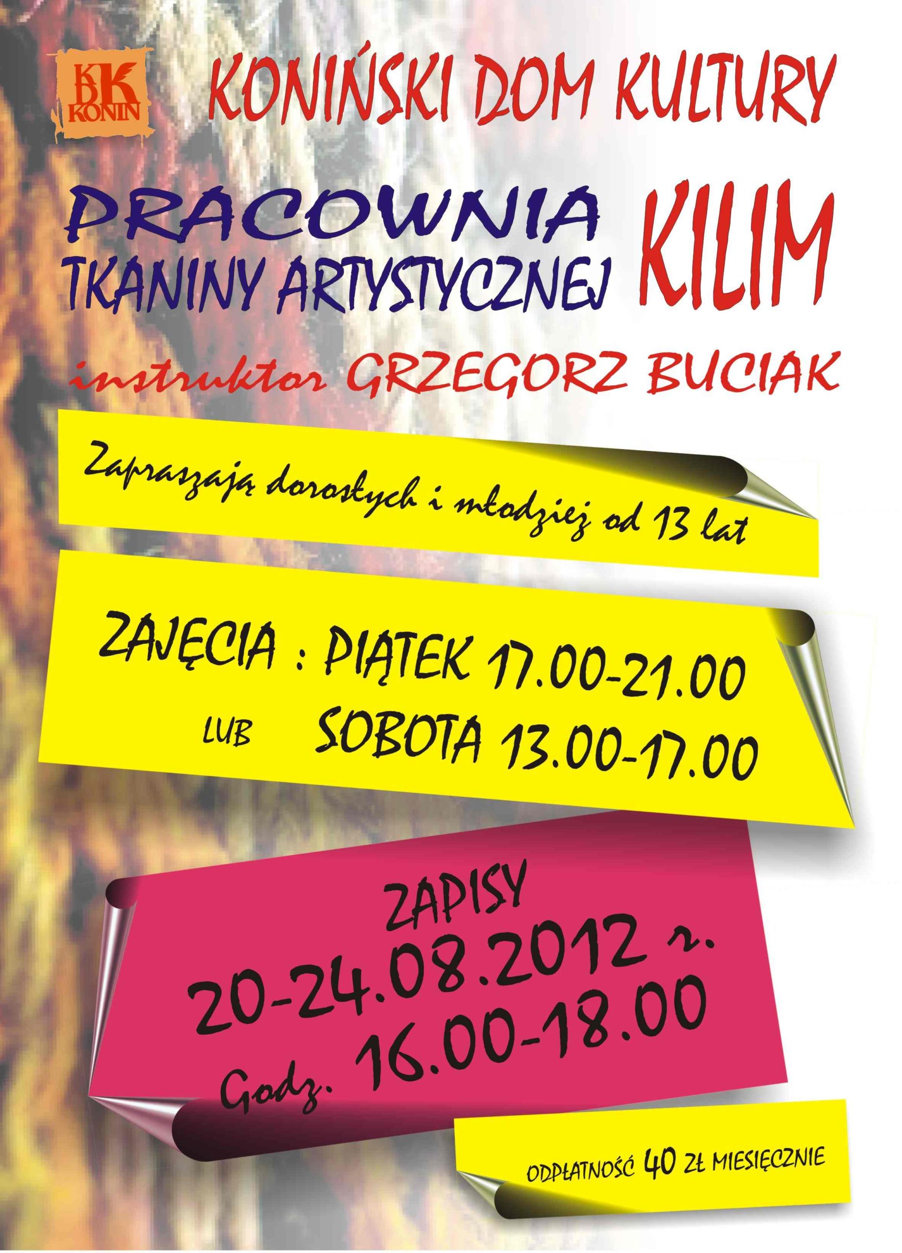Uczą cierpliwości, pozwalają spędzić wolny czas w miłym towarzystwie, ale przede wszystkim uczą jak samodzielnie wykonać prawdziwe arcydzieło. Mowa o zajęciach Pracowni Tkaniny Artystycznej Kilim, które od września będą odbywać się w Konińskim Domu Kultury. Zapisy do pracowni artystycznej trwają od dziś do piątku w godzinach 16:00-18:00. Miesięczna opłata za zajęcia wynosi 40 zł. Będą się one odbywać w od września w piątki i soboty.