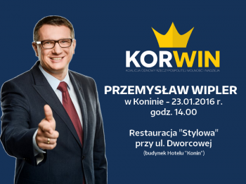 Działacze KORWiN zapraszają już jutro na spotkanie wszystkich działaczy i sympatyków partii KORWiN oraz idei konserwatywno-liberalnej. Podczas spotkania będzie można wysłuchać , gościa oraz zadać mu pytania.Spotkanie z Przemysławem Wiplerem odbędzie się w sobotę, 23 stycznia o godz. 14.00 w Restauracji "Stylowa" na ul. Dworcowej w na parterze budynku Hotel "Konin".