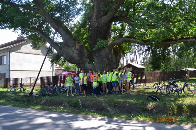 Wyjechaliśmy spod szkoły, a trasa rajdu prowadziła przez Feliksów, Zygmuntówek, Kotwasice, Dziadowice, Popielarze, Żdżenice, oraz Grąbków. Przejechaliśmy małą pętle po terenach naszej gminy, pokonując dystans około 24 km. Pogoda początkowo nie była sprzyjająca, było wietrznie i pochmurno, ale wraz z opiekunami absolutnie nie przestraszyliśmy się anomalii pogodowych i wyruszyliśmy mocnym składem w niezapomnianą podróż. W trakcie podróży warunki się zmieniły i kontynuowaliśmy rajd w słonecznej pogodzie. W trakcie jazdy mogliśmy nie tylko sprawdzić swoje siły i umiejętności jako cyklistów, ale po drodze zwiedzaliśmy ciekawe miejsca naszego regionu. Zatrzymaliśmy się pod najstarszym pomnikiem przyrody na terenie naszej gminy czyli w Kotwasicach – gdzie rośnie dąb„Bartek”. Kolejnym postojem na relaks oraz odpoczynek był postój w Dziadowicach, oraz krótki biwak na polanie leśnej w Żdżenicach. Trasa rajdu oraz stopień trudności były zróżnicowane, nie brakowało mocnych podjazdów szutrowych, krótkich i dynamicznych zjazdów czy polnej, leśnej drogi. Wszyscy w dobrych humorach, z wiatrem we włosach przejechaliśmy całą trasę, którą zakończyliśmy w szkole wspólnym grilem. Zmęczeni i zadowoleni posililiśmy się grilowanymi smakołykami. Na koniec stwierdziliśmy, że tego typu wyjazdów powinno być więcej, stąd decyzja o organizacji cyklicznych rajdów w kolejnym roku szkolnym.