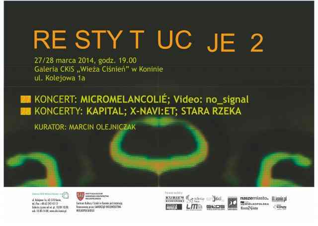 Restytucje to muzyka, która porusza, wybija ze słuchowych przyzwyczajeń, prezentując dla jednych – dźwięki do kontemplacji i refleksji, dla drugich – dźwięki do przeżywania. Dopełnieniem prezentacji dźwiękowych będą pokazy prac video. Zarówno w czwartek jak i w piątek koncerty rozpoczynają się o 19:00. Wstęp będzie wolny.