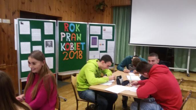 Uczniowie mieli okazję zapoznać się między innymi z historią praw kobiet (obejrzeli prezentację), poznali sylwetki polskich feministek i ciekawostki o prawach kobiet. Obejrzeli również fragment filmu „Sufrażystka”, który opowiada historię kobiety, która walcząc o swoje prawa utraciła prawie wszystko. Na koniec sprawdzili się w quizie tematycznym. Musieli wykazać się między innymi wiedzą na temat uzyskania przez Polki prawa wyborczego czy ochrony kobiet w ciąży. Na zakończenie obejrzeli wystawę na ten temat.