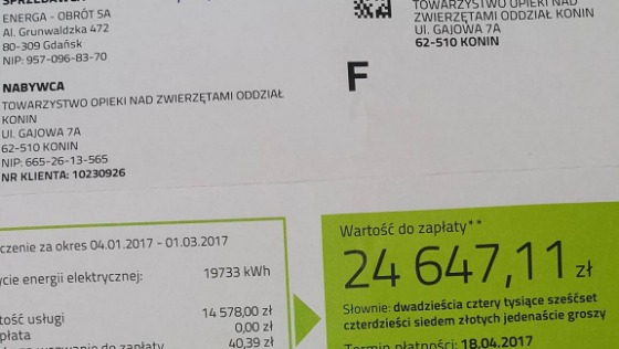 Schronisko dla Bezdomnych Zwierząt w Koninie walczy o godne życie dla zwierząt z naszego regionu. Oprócz wydatków bieżących jak jedzenie, lekarstwa czy podstawowe wyposażenie schroniska, na bieżąco przeprowadzane są najbardziej wymagające remonty. Miesiąc temu na władze schroniska czekała szokująca „niespodzianka” – rachunek na 24 647, 11 złotych za prąd. W obecnej sytuacji jest to kwota niemożliwa do spłacenia, jednak wiele osób dobrej woli już wsparło schronisko. Łącznie prawie na kwotę 6 tyś. złotych. Jak podkreśla schronisko większość wpłat są to datki nie przekraczające kwoty 30 złotych.
