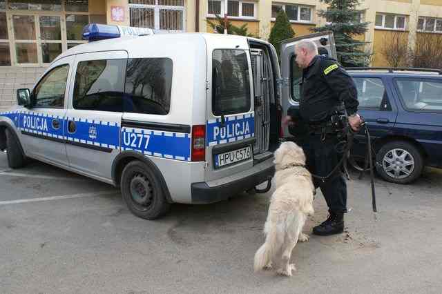 Policjanci z psem sprawdzają miejsca, do których dotarły alarmujące maile, sprawdzono już UKS-y i Sąd Okręgowy w Koninie. Nic nie znaleziono.