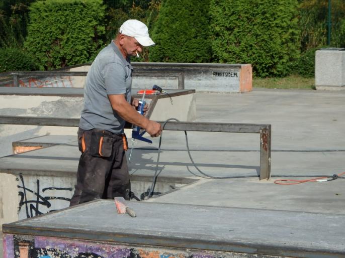 W rezultacie kilkuletniej eksploatacji i warunków pogodowych, jedna betonowa pochylnia od strony rzeki przesunęła się aż o 3 centymetry. Jak się dowiedzieliśmy od wykonawcy, nie była całkowicie unieruchomiona specjalnymi bolcami. Trzeba ja było naciągnąć na filarach na pierwotną pozycję. Pracownicy serwisu skate-parkowego zainstalowali nowe profile stalowe na krawędziach przeszkód. W jednym miejscu trzeba było usunąć duży prostokąt nawierzchni betonowej. Będzie w tym miejscu nowa wylewka.