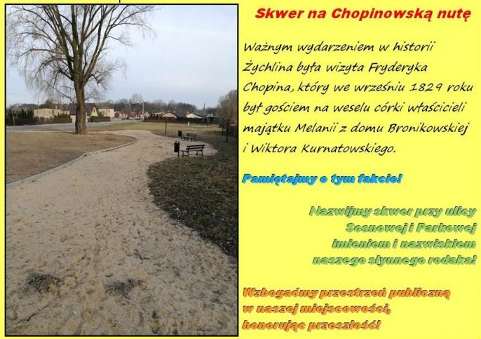 z wizyty Chopina w Żychlinie. Kolejnym krokiem podjętym przez Aleksandrę i Jakuba było wybranie skweru rekreacyjno-ekologicznego, znajdującego się na skrzyżowaniu ulic Sosnowej oraz Parkowej, jako miejsca, które mogłoby nosić imię sławnego kompozytora. Pomysł ten, jak się okazało, spotkał się z aprobatą Prezes Stowarzyszenia Przyjaciół Żychlina, Sołtysa Żychlina, a także Zastępcy Wójta Gminy Stare Miasto. Liczymy na to, że doczeka się on realizacji.