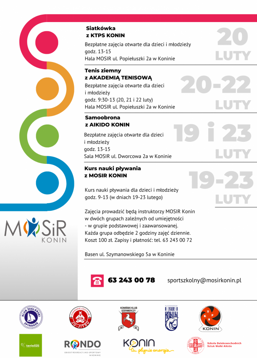 Miejski Ośrodek Sportu i Rekreacji w Koninie przygotował bogatą sportową ofertę zajęć oraz atrakcji dla dzieci i młodzieży w okresie feryjnym. Wszystkie wydarzenia odbędą się na naszych obiektach, pod okiem wykwalifikowanych instruktorów i trenerów. Poniżej prezentujemy naszą ofertę zajęć.
