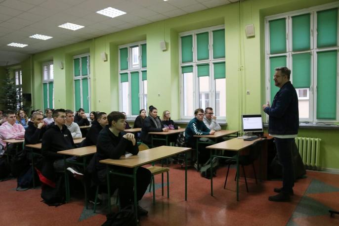 W trakcie prelekcji skierowanej do klas maturalnych, Tomasz Kopczyński przedstawił dostępne na rynku instrumenty wsparcia dla osób młodych, które dopiero wchodzą na rynek pracy.