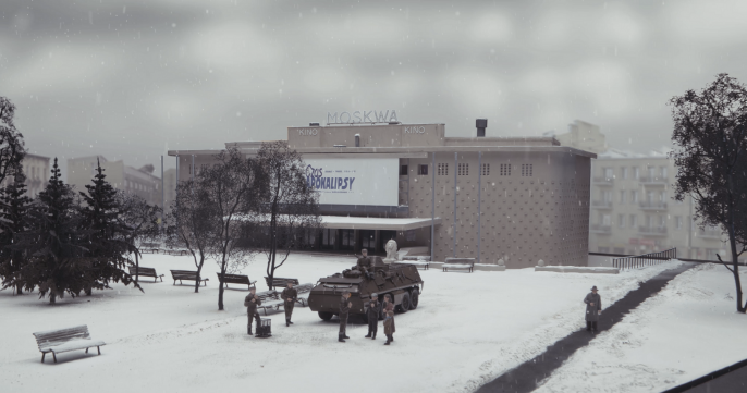 Makieta zrobiona jest na podstawie zdjęcia Chrisa Niedenthala – angielskie-go fotoreportera. To słynne zdjęcie ukazujące transporter opancerzony przed kinem " Moskwa" w Warszawie gdzie wyświetlany był akurat film : " Czas apokalipsy" obiegło cały świat jako symbol stanu wojennego.