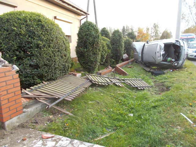 Po przybyciu na miejsce stwierdzono leżący na boku samochód osobowy marki Ford, który staranował ogrodzenie posesji. Kierowcy pomocy udzielał będący na miejscu Zespół Ratownictwa Medycznego.