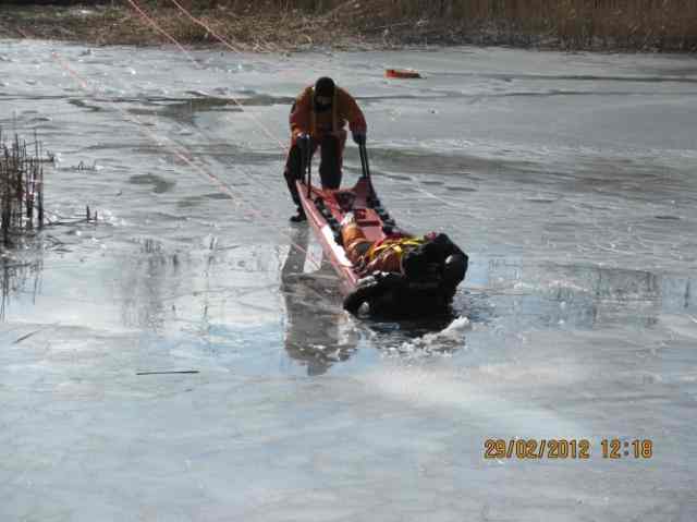 Niewątpliwą atrakcją, ale też przestrogą dla obserwujących dzieci były praktyczne ćwiczenia, które pokazały czym ryzykują osoby, które korzystają ze ślizgawek na zbiornikach naturalnych pokrytych lodem.Mimo już wiosennej aury, jeziorko przy „Galerii nad Jeziorem” stało się doskonałym miejscem do przeprowadzenia takiego pokazu, ponieważ grubość pokrywy lodowej sięgała miejscami nawet kilkunastu centymetrów.