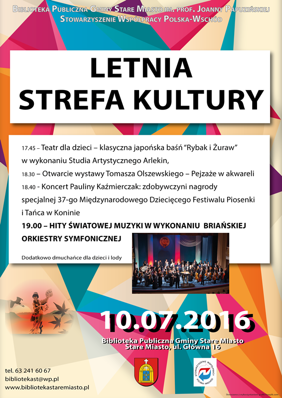 Strefa kultury Aktualności 04/07/2016 Mniej niż 1 min. FacebookTwitterWhatsApp MASZ WAŻNĄ WIADOMOŚĆ? Prześlij do naszej redakcji zdjęcie, film, lub informację! +48 63 242 01 01 Biblioteka Publiczna Gminy Stare Miasto zaprasza na Letnią Strefę Kultury – 10 lipca 2016r. godz. 17:45 - Reklama - PROMOCJA Wydarzenia„Dzieciństwo bez przemocy” Konin włącza się w ogólnopolską kampanię.Redakcja LP - 23 godziny ago0KulturaStypendia Prezydenta Miasta Konina w dziedzinie kulturyRedakcja LP - 2 dni ago0WydarzeniaZACHWYTNIKI 2025 – Wielkopolska pełna inspiracji!Redakcja - 20/10/20250ZdrowieNowoczesna Klinika Neurologii ICZMP – „Pomagamy Jak Umiemy” RossmannRedakcja LP - 14/10/20250AktualnościROSSMANN „MOJA DROGERIA” – NOWY WYMIAR ZAKUPÓW I BLISKOŚCIRedakcja - 10/10/20250 TagiFestyn,kultura,koncertGmina Stare Miasto PROMOCJA Stare MiastoHubertowski Piknik Myśliwski – tradycja i integracja w Starym MieścieRedakcja LP - 03/10/20250KoninPół wieku Wojewódzkiego Szpitala Zespolonego w Koninie – 26.09.2025 r.Redakcja LP - 02/10/20250AktualnościNoc Zawodowców 2025 w Kole – młodzież odkrywała zawody przyszłościRedakcja LP - 06/10/20250Kultura50 lat Wojewódzkiego Szpitala Zespolonego – część artystyczna jubileuszu!Redakcja LP - 02/10/20250Wydarzenia„Dzieciństwo bez przemocy” Konin włącza się w ogólnopolską kampanię.Redakcja LP - 23 godziny ago0 Szukaj Konin zachmurzenie duże enter location 13.1 ° C 13.1 ° 13.1 ° 89 % 8.5kmh 100 % czw. 13 ° pt. 11 ° sob. 14 ° niedz. 14 ° pon. 12 ° Sygnał24INFO IMGW ostrzega: silny wiatr nad regionem! 30/10/2025 Uwaga kierowcy! Zmiany w organizacji ruchu przy konińskich cmentarzach 30/10/2025 Konińska Policja apeluje: rozmawiajmy z dziećmi o konsekwencjach kradzieży 30/10/2025 Zmiana organizacji ruchu przy cmentarzu w Sompolnie – 1 listopada 29/10/2025 Policjanci z Konina zabezpieczyli nielegalny tytoń i papierosy bez polskich znaków akcyzy 29/10/2025 Poprzedni artykułLetnia Szkoła dla Rodziców z MOPiPRNastępny artykułNadleśnictwo Grodziec w Stawiszynie Mogłeś przegapić Koniec abonamentu RTV? Rząd szykuje duże zmiany w finansowaniu mediów publicznych Aktualności 30/10/2025 Dziewczęta z Wilczyna najlepsze w Wielkopolsce! „Z Orlika na Stadion” Sport 30/10/2025 Testy syren alarmowych w Elektrowni Pątnów – zaplanowane i bezpieczne Ciekawostki 30/10/2025