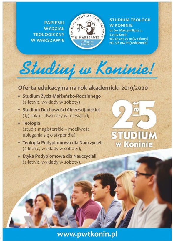 Studium Teologii w Koninie (zamiejscowy oddział Papieskiego Wydziału Teologicznego w Warszawie „Collegium Joanneum”) dziękując Bogu za 25 lat posługi dla dobra diecezji włocławskiej, z radością pragnie przedstawić ofertę edukacyjną na nowy rok akademicki: