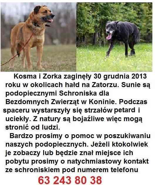 Z konińskiego schroniska uciekły dwa psy przestraszone hukiem petard.Czarna Zorka i ruda Kosma, dwie około dziesięcioletnie suki uciekły 30 grudnia w trakcie spaceru. Do zdarzenia doszło w okolicach jeziora Czarnego – psy przestraszyły się huku petard. Uciec mogły na Międzylesie, Posadę albo w stronę Rudzicy. Psy są nieufne wobec ludzi, osoby postronne mogą więc mieć kłopot z ich złapaniem. Ktokolwiek widział uciekinierki – proszony jest o kontakt ze schroniskiem pod nr 632438038.