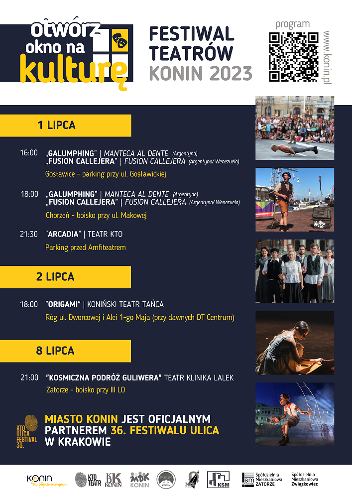 Po raz kolejny już współpracujemy z krakowskim teatrem KTO, który jest organizatorem ULICY, dzięki tej współpracy możemy gościć w Koninie artystów zagranicznych. W tym roku przyjadą do nas MANTECA AL DENTE z Argentyny i FUSION CALLEJERA – artyści reprezentujący Wenezuelę i Argentynę. Będą także Teatr KTO z Krakowa ze swoim najnowszym spektaklem „ARCADIA”, Koniński teatr Tańca z „Origami” oraz Teatr Klinika Lalek z ogromnymi lalkami, w wykonaniu którego zobaczymy „Kosmiczną podróż Guliwera”.