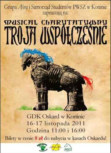 Grupa teatralna Afera i Samorząd Studentów PWSZ zapraszają na musical charytatywny „Troja Współcześnie”. Dochód ze spektaklu zostanie przeznaczony na rehabilitację siedmioletniego Olka Bielińskiego, który urodził się z porażeniem mózgowym.