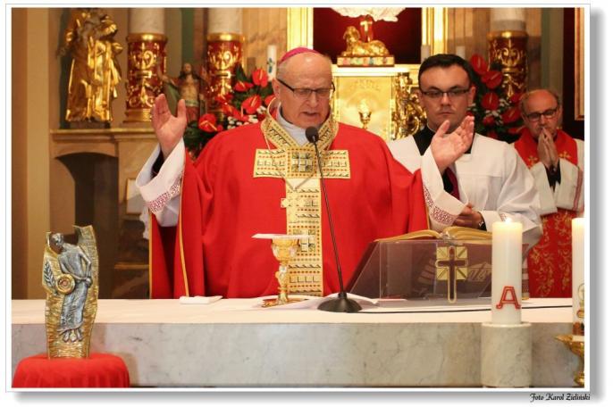 Na początku uroczystości Pasterz Diecezji poświęcił dwa nowe wizerunki, które niedawno uświetniły polichromię tuliszkowskiej świątyni: bł. biskupa Michała Kozala i Sługi Bożego kardynała Stefana Wyszyńskiego.