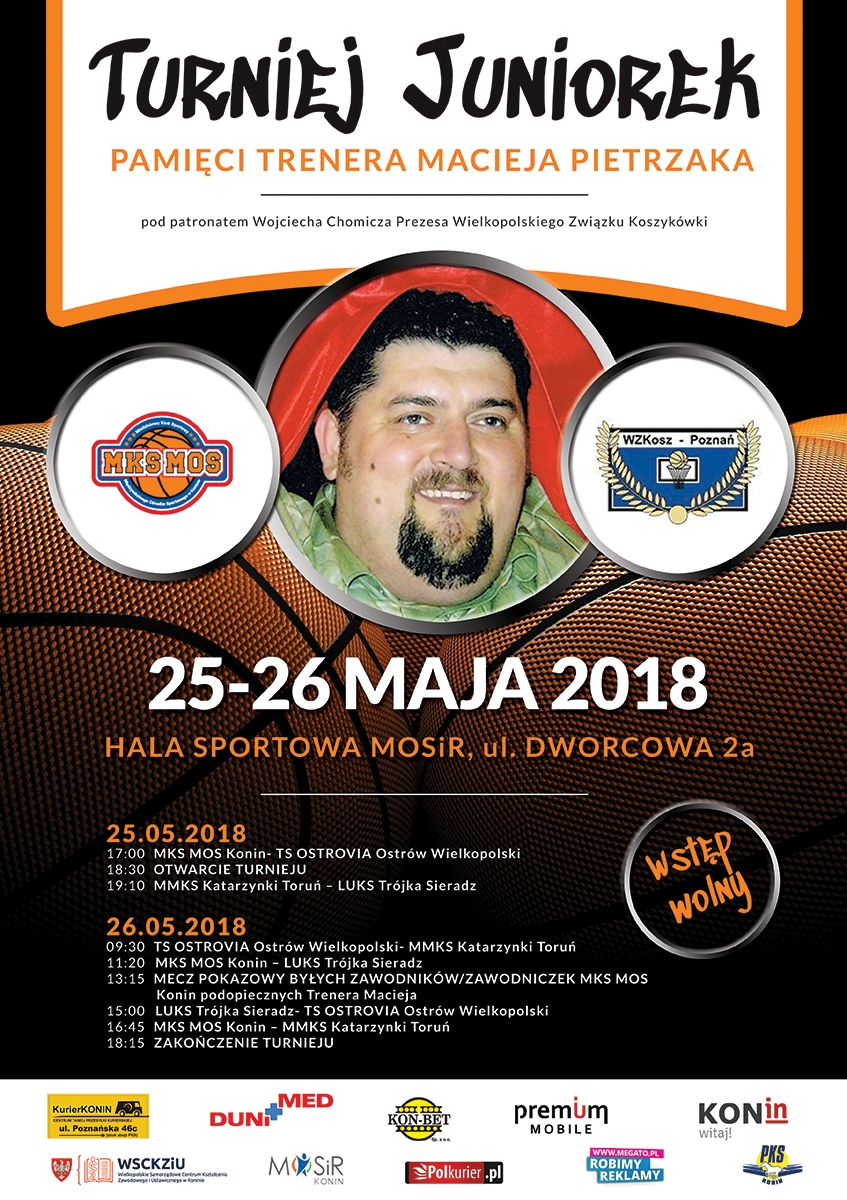 Turniej Juniorek Pamięci Trenera Macieja Pietrzaka, odbędzie się w dniach 25-26 maja 2018 roku w hali MOSiR przy ulicy Dworcowej 2a. Organizatorem Turnieju jest MOS MOS Konin. Patronat nad turniejem objął Wojciech Chomicz Prezes Wielkopolskiego Związku Koszykówki.