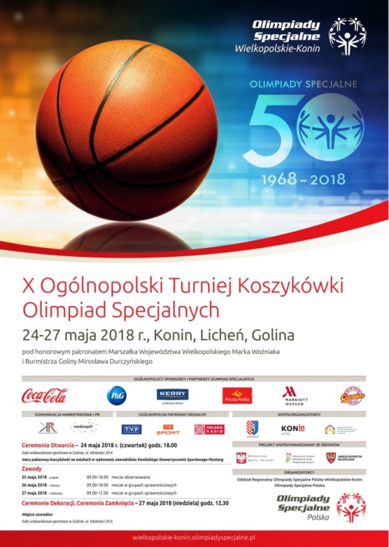 W imieniu Komitetu Organizacyjnego serdecznie zapraszamy na X Ogólnopolski Turniej Koszykówki Olimpiad Specjalnych Konin, Licheń, Golina 2018, który odbędzie się w dniach 24-27 maja pod honorowym patronatem Marszałka Województwa Wielkopolskiego Marka Woźniaka i Burmistrza Goliny Mirosława Durczyńskiego