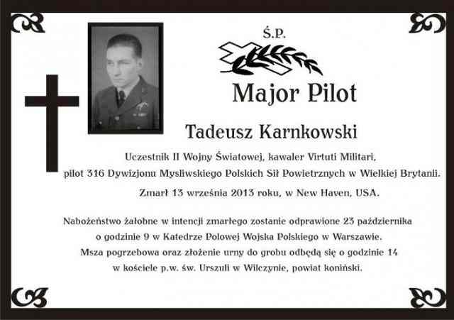 23 października 2013 r. odbędzie się pogrzeb mjr. pil. Tadeusza Karnkowskiego, pilota 316 dywizjonu myśliwskiego Polskich Sił Powietrznych w Wielkiej Brytanii.