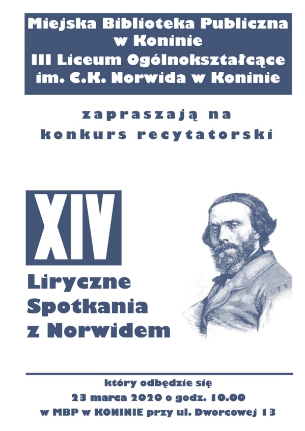III LO im. Cypriana Kamila Norwida w Koninie oraz Miejska Biblioteka Publiczna w Koninie zapraszają do udziału w konkursie recytatorskim XIV LIRYCZNE SPOTKANIA Z NORWIDEM. Ideą konkursu jest przybliżenie twórczości Cypriana Kamila Norwida – poety, dramaturga, grafika, filozofa. Zaproszenie kierujemy do uczniów w wieku 14-19 lat ze szkół miasta Konina i powiatu konińskiego