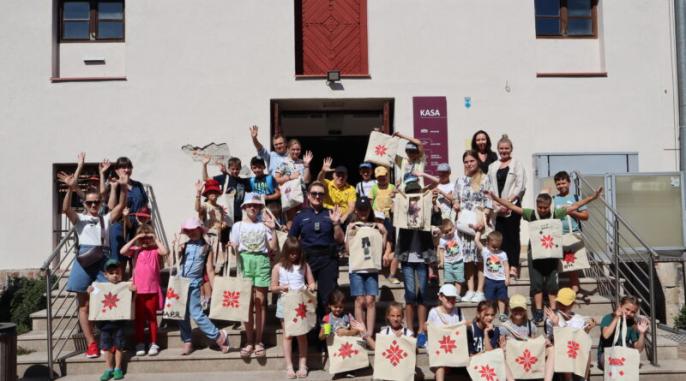 Później Muzeum Okręgowe w Koninie zaprosiło wszystkich gości na warsztaty plastyczne inspirowane ludowym haftem. W oparciu o przygotowane szablony, uczestnicy próbowali przenieść tradycyjny wzór na tkaninę, korzystając z ołówków i farb akrylowych. Barwne płócienne worki z pewnością niejednokrotnie posłużą w nadchodzącym roku szkolnym! Spotkanie zwieńczyło oprowadzanie z przewodnikiem. Wydarzenie uświetnił pokaz daktyloskopii przygotowany przez Komendę Miejską Policji w Koninie. Wszyscy chętni mogli także spróbować swoich sił w ciekawej technice malowania na wodzie.