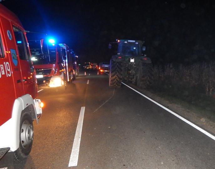 Stanowisko Kierowania Komendanta Powiatowego Państwowej Straży Pożarnej w Kole przyjęło zgłoszenie o wypadku drogowym na drodze wojewódzkiej nr 473. W miejscowości Chełmno doszło do wypadku samochodu osobowego Seata Leona z ciągnikiem rolniczym przewożącym ziarno kukurydzy. Do zdarzenia zadysponowane zostały dwa zastępy z JRG Koło oraz jeden zastęp z OSP Dąbie i jeden zastęp OSP Rzuchów. W wyniku rozpoznania na miejscu zdarzenia kierujący działaniem ratowniczym ustalił, że pojazdami podróżowali tylko kierowcy, którzy opuścili uszkodzone pojazdy przed przybyciem straży pożarnej. Działania zastępów straży pożarnej polegały na zabezpieczeniu miejsca zdarzenia, oraz oświetleniu terenu działań. Przybyły na miejsce zdarzenia Zespół Ratownictwa Medycznego zabrał kierowcę samochodu osobowego do szpitala. W działaniach ratowniczych brało udział 19 ratowników. Łączny czas trwania akcji ratowniczej wyniósł: 2 godz. 13 minut. Dochodzenie w sprawie przyczyny wypadku prowadzi Policja.