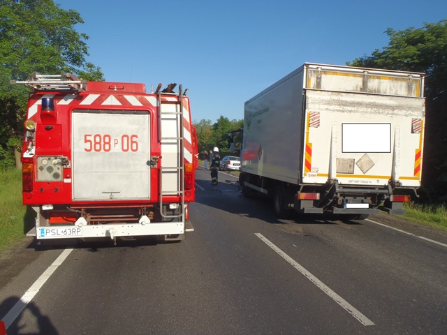 Po dojeździe do zdarzenia zastano  samochody ciężarowe znajdujące się na lewym pasie drogi oraz samochód osobowy będący częściowo na poboczu. Kierujący samochodem ciężarowym Iveco był uwięziony w kabinie, pozostałe osoby  opuściły pojazdy samodzielnie.  Strażacy używając piły do cięcia szyb wykonali dostęp do osoby rannej, następnie wydostano ją na zewnątrz. Poszkodowanemu udzielono kwalifikowanej pierwszej pomocy i przekazano Zespołowi Ratownictwa Medycznego.
