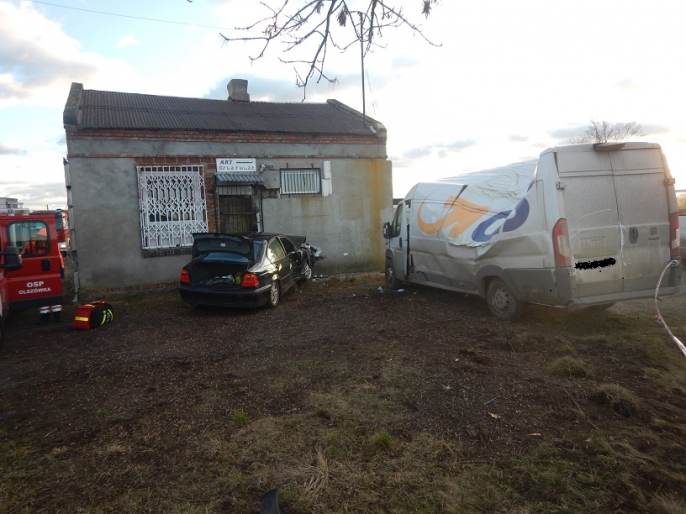 Na gminnej drodze zderzyły się dwa samochody: dostawczy Fiat Ducato i osobowe BMW 316, które w wyniku zdarzenia uderzyło w ścianę budynku po byłym sklepie. Dyżurny do działań zadysponował strażaków z Jednostki Ratowniczo-Gaśniczej w Kole oraz Ochotniczej Straży Pożarnej z Olszówki i Drzewiec. Po przybyciu na miejsce zdarzenia ustalono, że pojazdami podróżowali tylko kierowcy, którzy opuścili uszkodzone samochody przed przybyciem jednostek straży pożarnej, pomocy medycznej poszkodowanym udzielił będący na miejscu zdarzenia zespół ratownictwa medycznego Działania straży pożarnej polegały na zabezpieczeniu miejsca zdarzenia, odłączeniu dopływu prądu z akumulatorów w uszkodzonych pojazdach oraz zakręceniu zaworu butli LPG w samochodzie BMW. Działania ratownicze przez1 godzinę i 24 minuty prowadziło 12 strażaków. Dochodzenie w sprawie przyczyny wypadku prowadzi policja.
