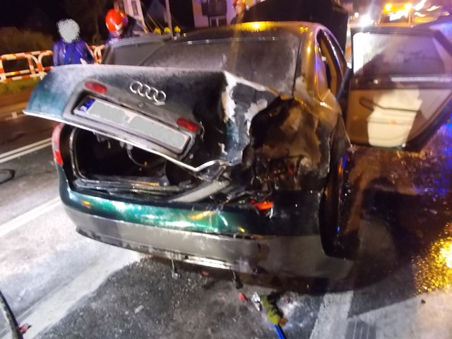Przybyli na miejsce zdarzenia strażacy stwierdzili, że doszło do zderzenia trzech samochodów, w tym dwóch osobowych (marki Audi i Opel) oraz dostawczego (marki Iveco). Uszkodzone samochody blokowały pas drogi w kierunku Konina. W wyniku zderzenia pojazd Audi uległ zapaleniu.