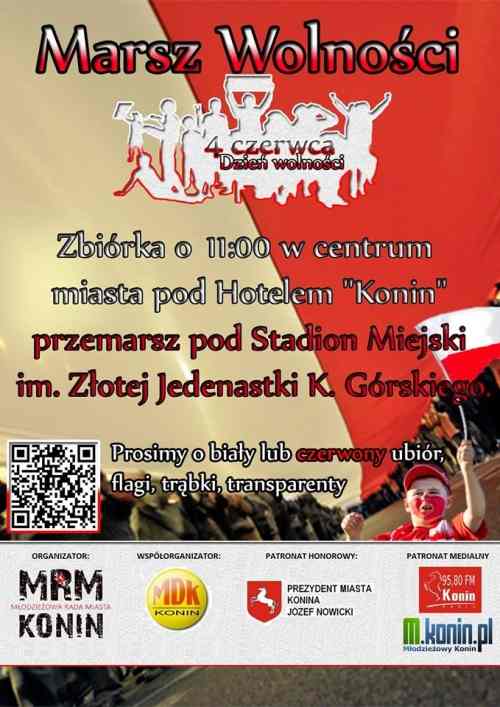 Z okazji rocznicy 4 czerwca przejdzie dziś przez Konin organizowany przez Młodzieżową Radę Miasta „Marsz Wolności”. Początek marszu o godzinie 11:00 przy Hotelu Konin. Jego uczestnicy udadzą się na stadion miejski im. Złotej Jedenastki Kazimierza Górskiego, gdzie wypuszczą w niebo biało-czerwone balony. Organizatorzy proszą uczestników o ubranie białej lub czerwonej koszulki oraz zabranie flag, transparentów i trąbek.