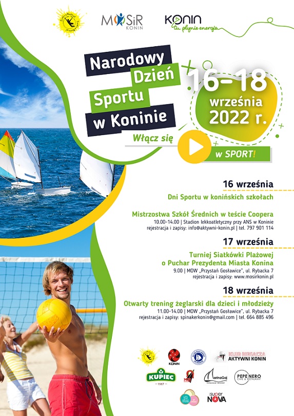 W Koninie święto trwać będzie przez cały weekend! W piątek w większości konińskich szkół odbywać się będą gry i zabawy sportowe. Organizator zaprasza także do kibicowania podczas Mistrzostw Szkół Średnich w teście Coopera, które odbędą się na stadionie lekkoatletycznym przy Akademii Nauk Stosowanych w Koninie. W sobotę organizator zaprasza również do udziału w Turnieju Siatkówki Plażowej o Puchar Prezydenta Miasta Konina, natomiast w niedzielę wszystkie chętne dzieci i młodzież będą mogły wziąć udział w otwartym treningu żeglarskim, który odbędzie się w MOW „Przystań Gosławice".