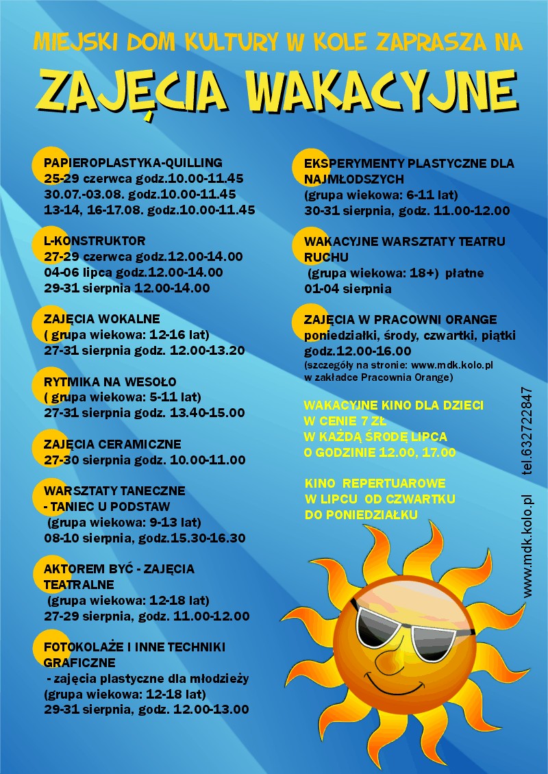 Zajęcia wakacyjne w MDK w Kole Aktualności 25/06/2018 Mniej niż 1 min. FacebookTwitterWhatsApp MASZ WAŻNĄ WIADOMOŚĆ? Prześlij do naszej redakcji zdjęcie, film, lub informację! +48 63 242 01 01 PROMOCJA Fundusze EuropejskieFundusze Europejskie wspierają rozwój wielkopolskich wsiRedakcja LP - 03/11/20250BiznesAsona Energy ogłasza inwestycję w krematorium w Koninie!Redakcja LP - 31/10/20250AktualnościUczennica Państwowej Szkoły Muzycznej w Koninie z prestiżowym stypendium Ministra Kultury!Redakcja - 31/10/20250Wydarzenia„Dzieciństwo bez przemocy” Konin włącza się w ogólnopolską kampanię.Redakcja LP - 29/10/20250KulturaStypendia Prezydenta Miasta Konina w dziedzinie kulturyRedakcja LP - 28/10/20250 Tagidom kultury,zajęcia,dzieciekologiawakacje,biblioteka PROMOCJA Fundusze EuropejskieFundusze Europejskie wspierają rozwój wielkopolskich wsiRedakcja LP - 03/11/20250BiznesAsona Energy ogłasza inwestycję w krematorium w Koninie!Redakcja LP - 31/10/20250AktualnościUczennica Państwowej Szkoły Muzycznej w Koninie z prestiżowym stypendium Ministra Kultury!Redakcja - 31/10/20250Wydarzenia„Dzieciństwo bez przemocy” Konin włącza się w ogólnopolską kampanię.Redakcja LP - 29/10/20250KulturaStypendia Prezydenta Miasta Konina w dziedzinie kulturyRedakcja LP - 28/10/20250 Szukaj Konin zachmurzenie małe enter location 6.1 ° C 6.1 ° 6.1 ° 87 % 3.3kmh 29 % pt. 14 ° sob. 13 ° niedz. 10 ° pon. 9 ° wt. 8 ° Sygnał24INFO Utrudnienia w ruchu w miejscowości Natalia – rusza remont drogi powiatowej 06/11/2025 Po alkoholu stracił orientację w lesie. Służby odnalazły go całego i zdrowego 06/11/2025 Szkolenie w Urzędzie Miejskim w Sompolnie – czasowe ograniczenia w obsłudze interesantów 06/11/2025 Strażnicy miejscy patrolowali trudno dostępne rejony Konina 06/11/2025 Dwóch nietrzeźwych kierowców ciężarówek zatrzymanych na autostradzie A2 05/11/2025 Poprzedni artykułLato w mieścieNastępny artykułZakończenie roku akademickiego w Studium Teologii w Koninie Mogłeś przegapić Seniorzy świętowali we Władysławowie – muzyka, wzruszenia i wspólna radość Aktualności 06/11/2025 Młodzi artyści z gminy Kleczew uczcili Święto Niepodległości poezją i pieśnią Aktualności 06/11/2025 Marszobieg Niepodległości i happening historyczny w ZSEU w Żychlinie Aktualności 06/11/2025